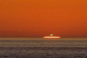 Ένα σπάνιο φυσικό φαινόμενο είναι η “πράσινη αχτίδα”. Στην ομώνυμη ταινία, του Ερίκ Ρομέρ φυσικά – στην οποία χώνομαι κάθε καλοκαίρι για να κάτσω για λίγο μόνο σε μια πεζούλα της Μπιαρίτζ την ώρα της άμπωτης -, υπάρχει μια σκηνή διάρκειας πέντε λεπτών, όπου ένας ηλικιωμένος κύριος εξηγεί στην παρέα του ότι το φαινόμενο οφείλεται στη διάθλαση του φωτός, τονίζοντας ότι είναι πολύ σπάνιο και η ατμόσφαιρα πρέπει να είναι πολύ καθαρή για να καταφέρει κανείς να το διακρίνει. Εγώ δεν το έχω δει ποτέ, ο Ιούλιος Βερν όμως το είδε (αναρωτιέμαι αν υπήρξε κάτι που ΔΕΝ είδε αυτός ο δαιμόνιος τύπος) και το έκανε βιβλίο το 1882, ιδού ένα απόσπασμα: