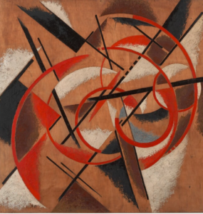 - Λιουμπόβ Ποπόβα, Χωροδυναμική κατασκευή, λάδι και σκόνη ξύλου σε κοντραπλακέ, 1921