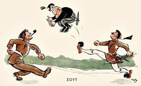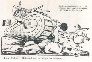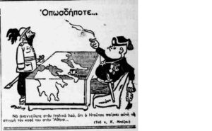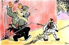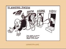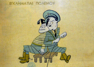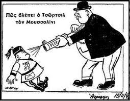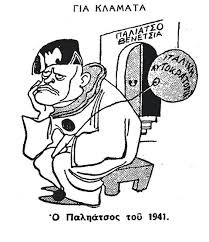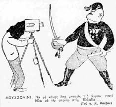 Η δικτατορία της 4ης Αυγούστου απαγόρεψε τη σάτιρα όλων των αρχηγών κρατών. Όμως ο πόλεμος έφερε λίγο τα πάνω κάτω κι ετσι τα πρωτοσέλιδα των εφημερίδων γέμισαν γελιογραφίες, που από τη μια κορόιδευαν τον (παλιό γνώριμο από την εισοβλή του 23 στην Κέρκυρα) Μπενίτο Μουσολίνι και από την άλλη εμψύχωναν τον πληθυσμό, καθώς στις περισσότερες από αυτές ο φασίστας Μουσολίνι νικιέται και τρέπεται σε φυγή από το… τσαρούχι. Μην ξεχνάμε επίσης ότι τα έντυπα της εποχής ήταν όλα καθεστωτικά, καθώς και ότι η απαγόρευση σάτριρας του Χίτλερ δεν αναιρέθηκε ποτέ, οι γελιογράφοι μόνο τον Μουσολίνι και το επιτελείο του είχαν “εύκολο”. Στα χρόνια της κατοχής ούτε αυτό ήταν εύκολο, οι γελοιογραφίες διακινούνταν παράνομα.
