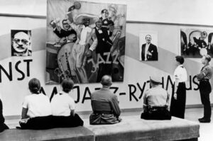 Το 1938 στην Έκθεση Εκφυλισμένης Μουσικής που οργάνωσαν οι Ναζί στο Ντίσελντορφ, η αφίσα της έκθεσης έδειχνε έναν μαύρο σαξοφωνίστα με το αστέρι του Δαβίδ στο πέτο του (αφού «οι εβραίοι είχαν μαύρο αίμα»), που παρέπεμπε στην όπερα Jonny spielt auf του νεωτεριστή Ερνστ Κρένεκ, μια όπερα που μιλούσε για έναν βιολιστή της τζαζ.